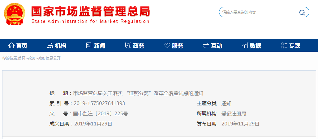 2019年11月6日,国务院印发《关于在自由贸易试验区开展“证照分离”改革全覆盖试点的通知》(国发〔2019〕25号,以下简称《通知》),决定自12月1日起在全国自贸试验区开展“证照分离”改革全覆盖试点,推动照后减证和简化审批。全国市场监管系统要把思想和行动统一到党中央、国务院的重大决策部署上来,深刻理解“证照分离”改革全覆盖试点对优化营商环境、激发市场活力的重要意义,认真落实各项改革任务。现就有关事项通知如下:一、要严格落实分类推进改革要求。《“证照分离”改革全覆盖试点事项清单(中央层面设定,2019年版)》共涉及市场监管领域17个涉企经营许可事项(不含国家知识产权局、国家药监局事项),其中,直接取消审批1项,审批改为备案1项,实行告知承诺3项,优化审批服务12项,总局逐项细化制定了具体改革举措和事中事后监管措施,对改革内容、法律依据、许可条件、材料要求、程序环节、监管措施等作出明确规定(见附件1-17)。各级市场监管部门要认真贯彻执行。二、要做好市场监管领域涉企经营许可规范管理和数据共享工作。要持续推进市场监管部门行政许可服务标准化、规范化、便民化,实现“一门、一窗、一网”服务。总局将建立经营范围规范表述目录,推行经营范围规范化登记工作,各地市场监管部门要按照总局统一部署,切实做好企业登记注册和涉企经营许可事项的有序衔接。要强化信息共享运用,根据《“证照分离”改革试点数据共享方案》(见市监注〔2019〕63号)和《市场监管部门“证照分离”改革试点信息技术方案》(见附件18)要求,积极推进系统对接和协同,确保企业登记注册、经营许可、行政处罚等信息实现数据交互和归集共享。改革试点实施后,申请人已经向市场监管部门提供过的材料信息,或者涉及市场监管部门出具的营业执照等证明材料,除法律、法规有明确规定外,原则上要通过内部信息共享获取,不得再要求申请人提供。三、要做好管理方式转变衔接工作。对“直接取消审批”和“审批改为备案”的事项,不得再实施审批管理,已受理的企业申请要依法终止审批程序,改为备案的要及时纳入“多证合一”改革。对“实行告知承诺”的事项,已受理的企业申请要允许企业自愿选择审批方式。对“优化审批服务”的事项,已受理的企业申请要按调整后的办事规则和材料规范进行审批。四、要及时向总局请示汇报各地自主改革工作。各地省级人民政府决定在自贸试验区以外有条件的地方进行扩大试点,或者对具体事项采取更大力度改革举措,涉及市场监管领域涉企经营许可事项的,要及时向总局相关司局进行请示汇报,做好沟通衔接工作。各地市场监管部门要坚决贯彻落实《通知》要求,做好政策解读、人员培训、系统改造等工作,确保按时高质量实施改革试点工作。同时,要注意总结贯彻落实过程中的好经验、好做法。对推进改革中出现的重大问题和情况,要及时上报总局。联系人:登记注册局 王丹,电话:010-88650862附件:1. 从事强制性认证以及相关活动的检查机构指定18.市场监管部门“证照分离”改革试点信息技术方案
